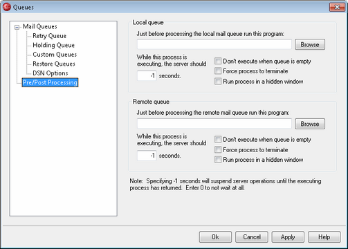 This field specifies a program path and name that will be executed just prior to the processing and delivery of any RFC-2822 messages that might be in the local or remote message queues. If complete path information is not provided, MDaemon will first search for the executable in the MDaemon directory, then in the Windows System directory, next in the Windows directory, and finally the directories listed in the PATH environment variable.
