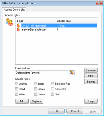 Access rights are controlled through MDaemon's support for Access Control Lists (ACL). ACL is an extension to the Internet Message Access Protocol (IMAP4), which makes it possible for you to create an access list for each of your IMAP message folders, thus granting folder access rights to other users who also have accounts on your mail server. If your email client doesn't support ACL you can still set the permissions via the controls on this dialog. ACL is fully discussed in RFC 2086, which can be viewed at: http://www.rfc-editor.org/rfc/rfc2086.txt. |
