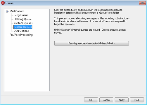 By default, a new installation of MDaemon stores message queues such as Remote, Local, Raw, and the like under the \MDaemon\Queues\ subfolder. Previous versions of MDaemon stored queues elsewhere. If your installation of MDaemon is using the old folder locations and you would like to move your queues to this more organized structure then click this button and all queues and the files and messages they contain will be moved for you. After clicking this button you will need to restart MDaemon for the changes to be implemented.