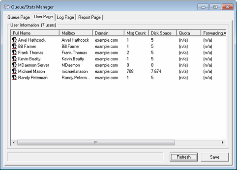When the User Page is chosen, a list of all MDaemon accounts is loaded into the User Information list box. This list contains each user's full name, the name of their mailbox, the domain to which the account belongs, the number of messages it contains, its mail format, the amount of disk space (in kilobytes) that the account is taking up, their forwarding address, and finally, the date that their mail was last checked. Given that the information contained in this list is constantly changing, it can be easily updated by clicking the Refresh button.