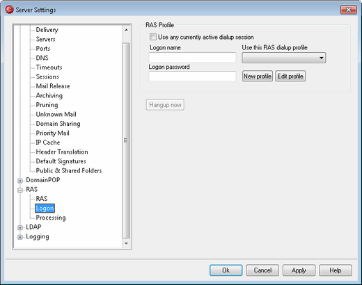 This button will close the connection to the ISP. This button is active only when MDaemon initiated the RAS session.