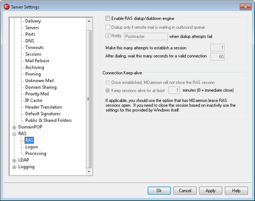 Once established, MDaemon will not close the RAS session