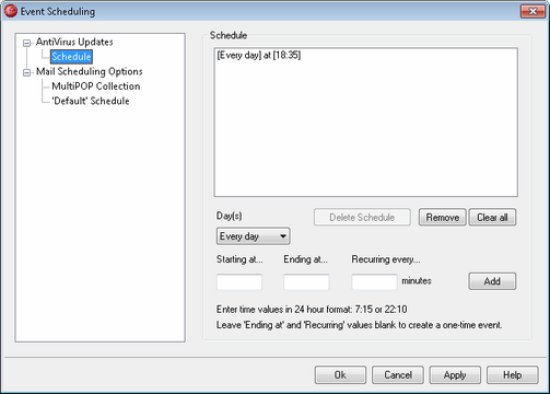This is the time interval at which SecurityPlus will check for updates between the designated Starting at... and Ending at... times. Leave this option blank if you wish it to be a single event rather than recurring event.