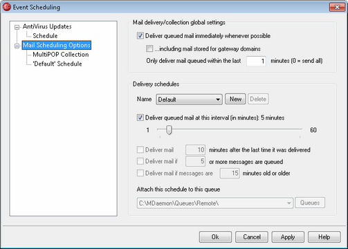 Click Setup » Server Settings » Event Scheduling to open MDaemon's Event Scheduler. The Mail Scheduling Options section of this dialog makes it possible for you to schedule MDaemon's Remote mail processing events as extensively or as simply as you prefer. You can use a counter to process mail at regular intervals, or you can schedule exact times for mail delivery and collection using the Mail Schedule screens. You can also set conditions that will trigger mail processing at unscheduled times such as when a certain number of messages are waiting to be delivered, or when a message has been waiting a specified amount of time. Further, you can create custom schedules that you can assign to custom remote mail queues. Custom schedules make it possible for you to set different schedules for different types of messages. For example, you could create schedules for large messages, mailing list messages, certain domains, and so on.