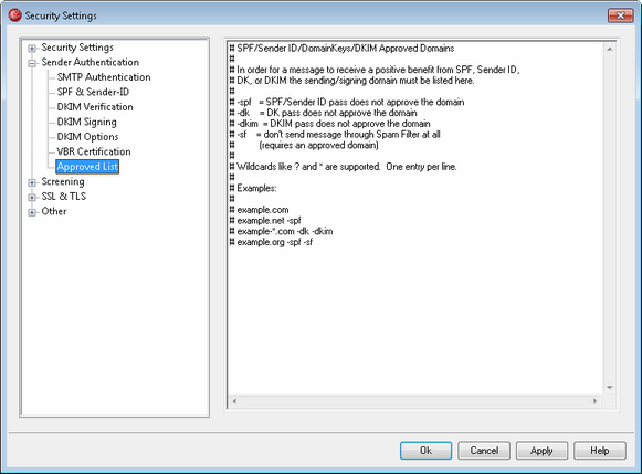 Because some spammers and senders of bulk email have begun using SPF or signing messages with valid DK or DKIM signatures, the fact that a message is signed and verified is no guarantee that you won't consider it to be spam, even though it does ensure that the message originated from a valid source. For this reason, a message's spam score will not be lowered as a result of SPF, Sender ID, DK, or DKIM verification unless the domain taken from the signature is on the Approved List. This is essentially a white list that you can use to designate domains permitted to have their messages' spam scores reduced when those incoming messages are verified.
