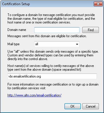 After enabling the Insert certification data into outgoing messages option above, click this button to open the Certification Setup dialog. On this dialog you will designate the domain whose outbound messages will be certified, the types of mail that will be certified, and the CSPs associated with the domain.