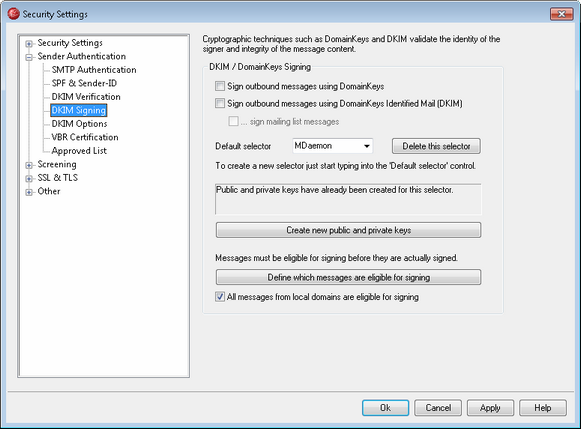 Click this option if you wish to use DomainKeys Identified Mail to cryptographically sign some outgoing messages. In order for a message to be signed, it must meet the criteria designated under the Define which messages are eligible for signing button and be received by MDaemon for delivery on an authenticated session. There is also a Content Filter action, "Sign with DKIM selector..." that you can use to cause messages to be signed.