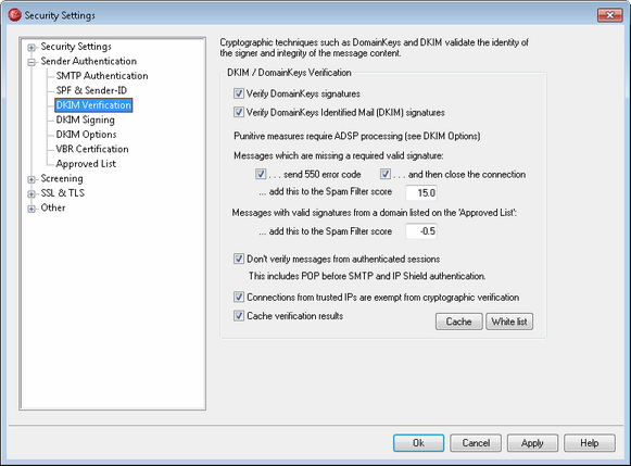 Use this screen to configure MDaemon to verify DomainKeys Identified Mail (DKIM) and/or DomainKeys (DK) signatures in incoming remote messages. When this feature is enabled and an incoming message has been cryptographically signed, MDaemon will retrieve the public key from the DNS record of the domain taken from the signature and then use that key to test the message’s DKIM or DK signature to determine its validity.