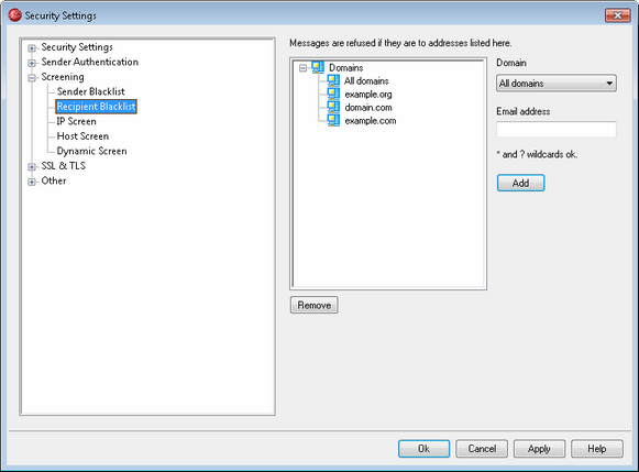 The Recipient Blacklist is located at: Security » Security Settings » Screening. This list contains email addresses that are not allowed to receive mail through your server. If a message arrives for an address on this list, it will be refused. Addresses may be blacklisted on a per domain basis or globally (applied to all MDaemon domains). The Recipient Blacklist operates on SMTP envelope RCPT data only (not message headers).