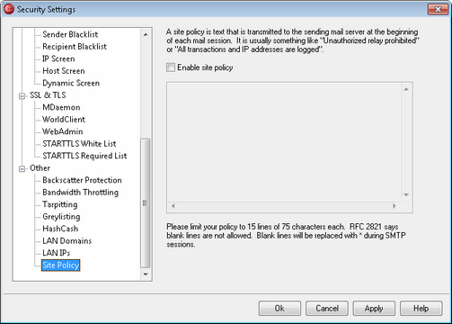 Use this dialog to specify a Site Policy statement for your server. The text is stored in the policy.dat file located in MDaemon's \app\ subfolder and is transmitted to sending servers at the beginning of every SMTP mail session. An example of a common site policy is, "This server does not relay" or "Unauthorized use prohibited." You do not need to prepend each line with "220" or "220-". MDaemon handles each line accordingly, either with or without these prepended codes.