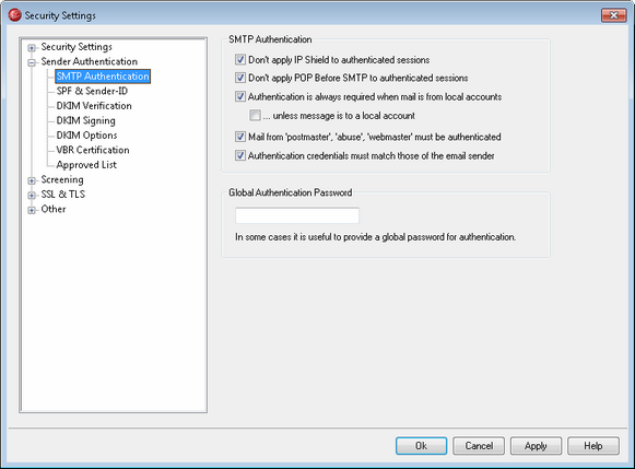 When this control is active, the IP Shield restrictions will not apply to authenticated users. Mail will be accepted from an authenticated user regardless of the IP address from which he or she connects. Further, when a user doesn't authenticate and access is refused, the message returned to the SMTP client will be "Authentication required" in order to give the user a clue that he can fix the problem by configuring the mail client to use authentication before sending a message. This option is enabled by default.