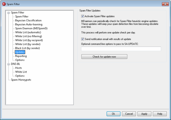 Click this check box if you want the Spam Filter be updated automatically. Once per day MDaemon will to see if there are any updates available for the Spam Filter heuristics engine, and if so it will download and install them automatically.