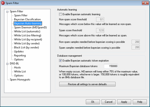 Bayesian Auto-learning is unavailable when you have configured MDaemon to use another server's MDaemon Spam Daemon (MDSpamD) for Spam Filter processing. All Bayesian learning will be performed on the other server. See the Spam Daemon screen for more information. |