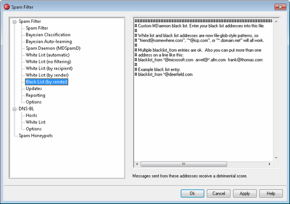 Including an address on this black list does not automatically guarantee that a message from that address will be considered spam. Instead, messages from the black listed addresses will have the amount specified on the Spam Filter screen added to their spam scores. For example, if you have the spam score threshold set to 5.0 and the black list value on the spam filter screen set to 50, and a particularly low-scoring message arrives that gets a spam score of -50.0 or lower before the black list value is added, then the final spam score of the message will be less than 5.0, thus denoting it as a legitimate non-spam message. This would rarely happen, however, because messages rarely have that much subtracted from their spam scores unless they contain some other special element, such as a white listed address.