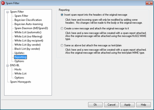 The Spam Filter Reporting options are unavailable when you have configured MDaemon to use another server's MDaemon Spam Daemon (MDSpamD) for Spam Filter processing. Spam Filter Reporting will be controlled by the other server's settings. See the Spam Daemon screen for more information. |