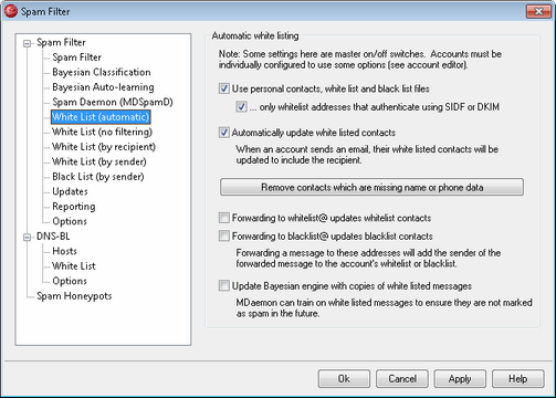 When this option is enabled, accounts using the "Spam Filter uses personal contacts, white list, and black list files" on the Account Editor's Options screen can forward messages to whitelist@<domain> and have MDaemon add the sender of the original message to the account's white list. The white listed address is taken from the forwarded message's From header.