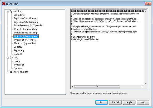 Including an address on this white list does not automatically guarantee that a message to that address will not be considered spam. Instead, messages to the white listed addresses will have the amount specified on the Spam Filter screen subtracted from their spam scores. For example, if you have the spam score threshold set to 5.0 and the white list value set to 50, and then a particularly excessive spam message arrives that gets a spam score of 55.0 or higher before the white list value is subtracted, then the final spam score of the message will be at least 5.0, thus denoting it as spam. This would rarely happen, however, because spam rarely has a value that high unless it contains some other exceptionally high-scoring element, such as a blacklisted address.