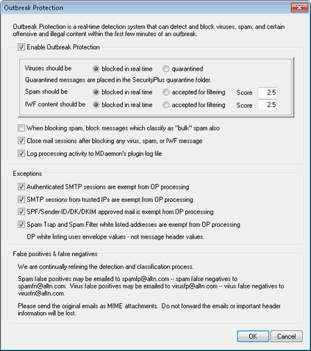 Outbreak Protection (OP) is a revolutionary real time anti-spam, anti-virus, and anti-phishing technology capable of proactively protecting an MDaemon email infrastructure automatically and within minutes of an outbreak. Included in SecurityPlus for MDaemon, Outbreak Protection requires SecurityPlus for MDaemon 3.0 or later and MDaemon PRO 9.5 or later, and it is accessible from MDaemon's Security menu (Security » Outbreak protection..., or Ctrl+Shift+1).