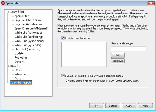 Spam Honeypots (located at Security » Spam Filter » Spam Honeypots) is for designating local email addresses purposely designed to collect spam. These spam honeypots are not valid MDaemon accounts or address aliases and should never be used for sending or receiving legitimate email. But, by posting a honeypot address to a news group, public mailing list, or other source from which spammers often farm addresses, you should begin to see incoming messages addressed to the spam honeypots — you could also pull addresses from other spam that you have received addressed to other invalid local addresses. Because honeypots will never receive legitimate email, all incoming messages addressed to them will always be routed directly to your Bayesian spam trap folder for processing. Further, the IP addresses of the sending servers can optionally be added to the Dynamic Screening system, banning future connections from those addresses for a designated period of time. All of this helps increase the probability of identifying and blocking spam in the future.
