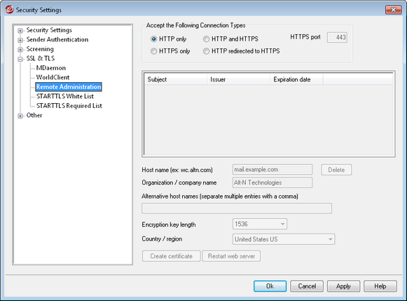 This screen only applies to Remote Administration when using MDaemon's built-in web server. If you configure Remote Administration to use some other web server such as IIS, these options will not be used — SSL/HTTPS support will have to be configured using your the other web server's tools. |