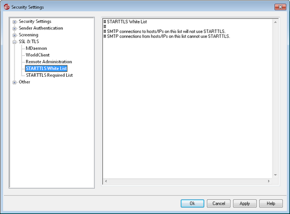 Use this white list to prevent the use of STARTTLS when sending or receiving mail to or from certain hosts or IP addresses.