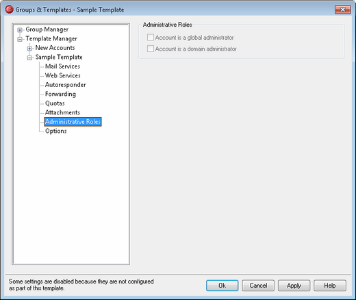 This screen is not available on the New Accounts template. Administrative access cannot be automatically granted to new accounts. To grant administrative access to an account, associate the account with a customized template that uses this screen to grant that access, or manually designate the account as an administrator from the Account Editor's Administrative Roles screen. |