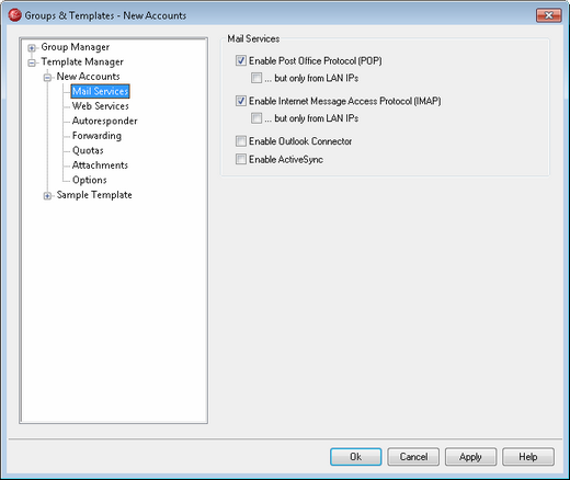 When this box is checked, accounts with settings controlled by this template can be accessed via Post Office Protocol (POP). Virtually all email client software supports this protocol. Clear this checkbox if you do not wish to allow POP access.