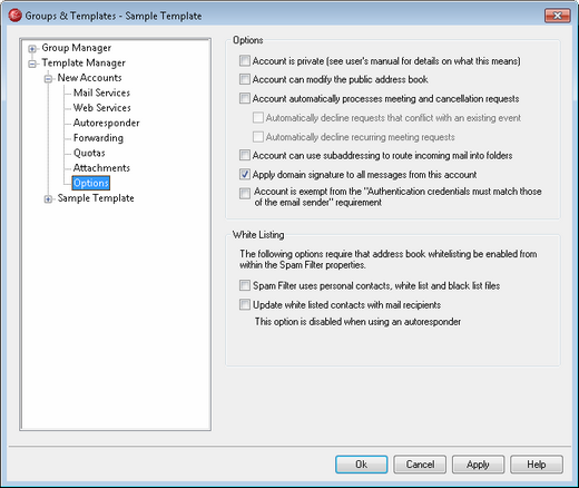 The options on this template screen correspond to the settings located on the Account Editor's Options screen. When a template is set to control this screen, it will control the Options screen settings for any account belonging to a Group that utilizes the template.