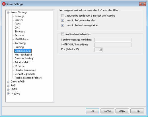 By default, messages that arrive at the server destined for unknown yet supposedly local users will be forwarded to whatever user has been aliased as the postmaster. Disable this option if you do not wish to send these messages to the Postmaster.