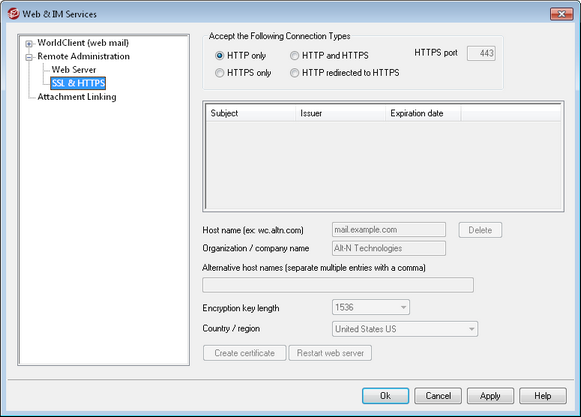This screen only applies to Remote Administration when using MDaemon's built-in web server. If you configure Remote Administration to use some other web server such as IIS, these options will not be used — SSL/HTTPS support will have to be configured using your the other web server's tools. |