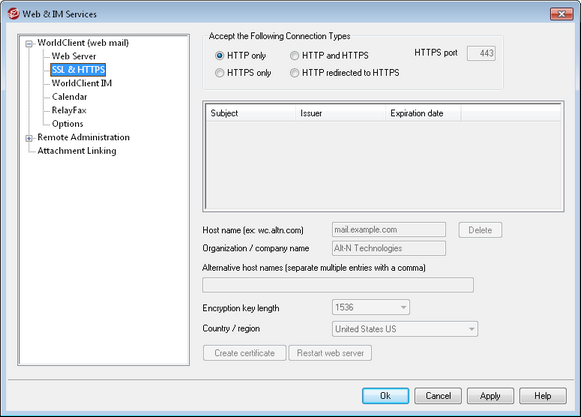 This screen only applies to WorldClient when using MDaemon's built-in web server. If you configure WorldClient to use some other web server such as IIS, these options will not be used — SSL/HTTPS support will have to be configured using your the other web server's tools. |