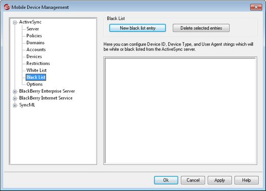 To add an entry to the list, click New black list entry, specify the device info, and click Ok. You can obtain the device info from the device itself or from the ActiveSync log files if the device has connected to MDaemon's ActiveSync server.