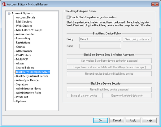 Click this checkbox to enable the account for BlackBerry device synchronization. BlackBerry enabled accounts appear on the BlackBerry Enterprise Server » Devices screen and can activate a BlackBerry device via USB cable in WorldClient or over the air (OTA) from the device itself (not all devices support OTA activation).