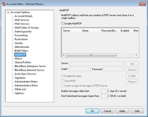 This is the number of days that a message can remain on the MultiPOP host before it will be deleted. Use “0” if you do not wish to delete older messages.