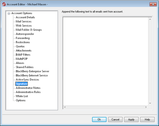 Use this screen to designate a signature that will be appended to the bottom of every email that the account sends. This signature is added in addition to any other signatures or footers added by other options, such as the signature option included in WorldClient and other mail clients, the Default and Domain signature options, and Mailing List footers. Default/Domain Signatures and Mailing List footers are always added below Account Signatures.