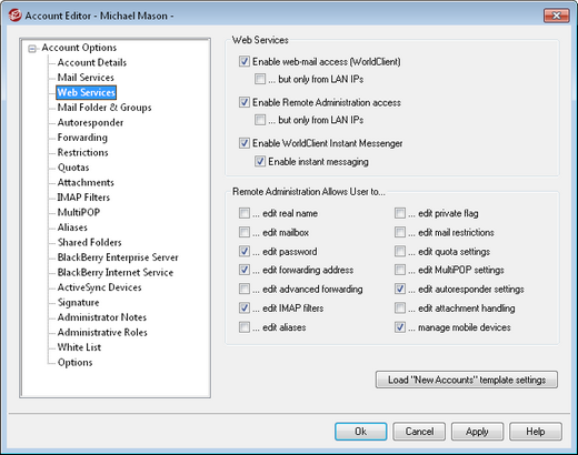 Check this box if you wish to grant the user permission to modify his or her account settings via Remote Administration. The user will only be able to edit those settings that you designate below.