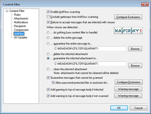 Choose this option and specify a location in the space provided if you want infected attachments to be quarantined to that location rather than deleted or cleaned. Like the "Delete the infected attachment" option, the message will still be delivered to the recipient but without the infected attachment.