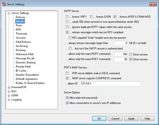 Click this box if you wish to support the IMAP COMPRESS extension (RFC 4978), which compresses all data sent to and from the client. COMPRESS will increase CPU and memory usage per IMAP session.