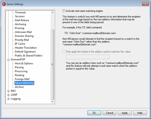 The Name Matching feature is only active in conjunction with the DomainPOP Mail Collection engine. If you wish to use this feature, you must make sure that you have DomainPOP enabled. DomainPOP can be reached from the "Setup » Server Settings » DomainPOP" menu selection.