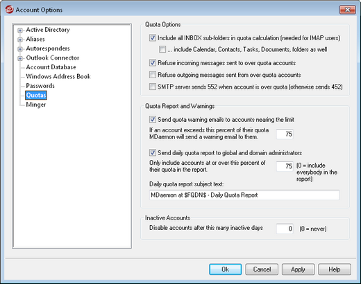 Check this box and specify a value if you wish to send a daily quota report to all global and domain administrators. The report will contain quota statistics for all users at or over the designated percentage of their quota restriction. Use "0" as the value if you want the report to include quota statistics on everyone.