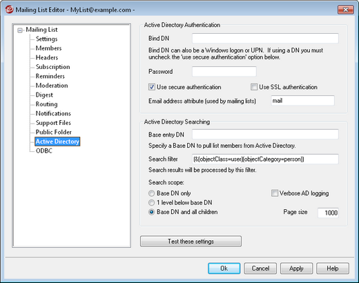 Click this checkbox if you wish to use secure authentication when performing your Active Directory searches. You cannot use this option when you are using a DN rather than a Windows logon in the Bind DN option above.