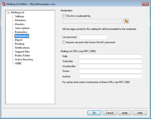 Check this box and specify an account if you wish the list to be moderated by the designated user. Moderated lists forward all posts to the moderator. The moderator alone may submit or forward messages to the list.