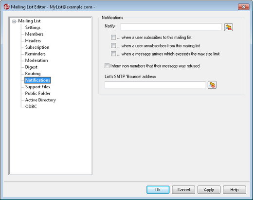 Use this option to specify the address that should receive any "bounced" mail or deliver status notification messages generated from list traffic. Any given message to a mailing list with 100 recipients might have, for example, ten undeliverable addresses due to address changes, down servers, or the like. The SMTP system will generate and return to the sender of the message a notification message concerning these undeliverable conditions. Using this option you can designate the address that should receive these messages for your mailing lists. You can also choose for no one to receive them, in which case MDaemon will place list mail into the mail stream in such a way that return mail will not be possible. This address should NOT be the mailing list's address.
