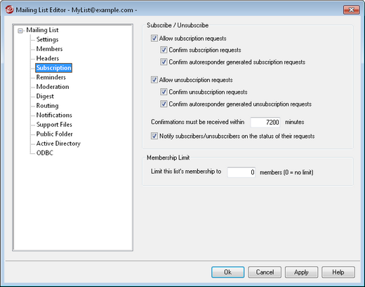 This option controls whether or not the list will allow subscription requests, either through specially formatted email messages or through autoresponders. For more information, see: Subscribing to Mailing Lists.