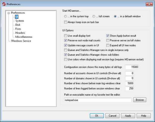 Notepad.exe is the general text editor that the MDaemon UI will launch by default when needed. If you prefer to use a different text editor, enter its file path or executable name here.