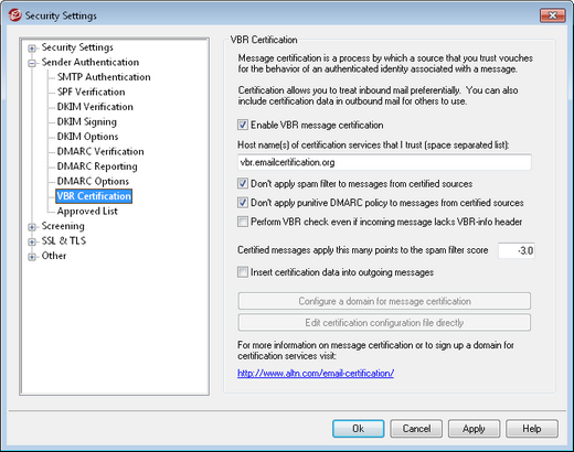The VBR Certification dialog is located at: Security » Security Settings » Sender Authentication » VBR Certification.