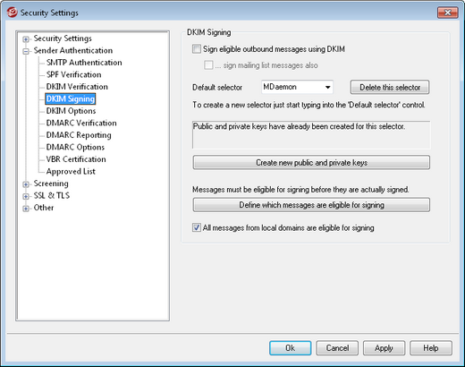 Click this option if you wish to use DomainKeys Identified Mail to cryptographically sign some outgoing messages. In order for a message to be signed, it must meet the criteria designated under the Define which messages are eligible for signing button and be received by MDaemon for delivery on an authenticated session. There is also a Content Filter action, "Sign with DKIM selector..." that you can use to cause messages to be signed.