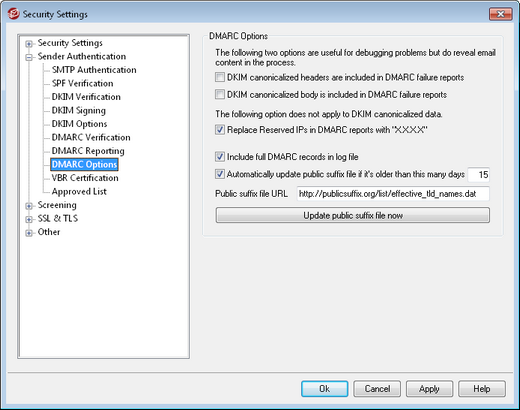 DMARC requires a public suffix file to reliably determine the proper domains to query for DMARC DNS records. By default MDaemon will automatically update its stored public suffix file whenever it exceeds 15 days old. Change the value of this option if you wish to update the public suffix file more or less often. Disable the option if you do not wish to update it automatically.