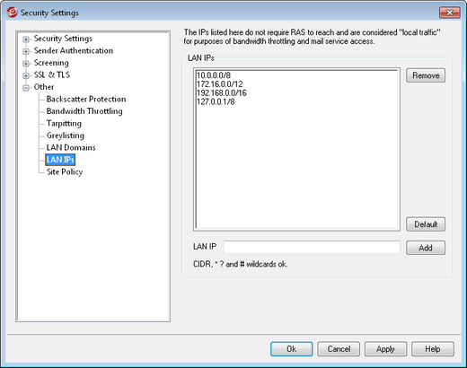 Similar to LAN Domains, this screen is used to list IP addresses that reside on your LAN (local area network). These IP addresses therefore do not require RAS or an Internet connection to reach them, and they are treated as local traffic for the purposes of bandwidth throttling. Further, there are various other security and spam prevention restrictions that they may be exempt from since they are local addresses.