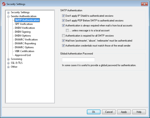 When this control is active, the IP Shield restrictions will not apply to authenticated users. Mail will be accepted from an authenticated user regardless of the IP address from which he or she connects. Further, when a user doesn't authenticate and access is refused, the message returned to the SMTP client will be "Authentication required" in order to give the user a clue that he can fix the problem by configuring the mail client to use authentication before sending a message. This option is enabled by default.